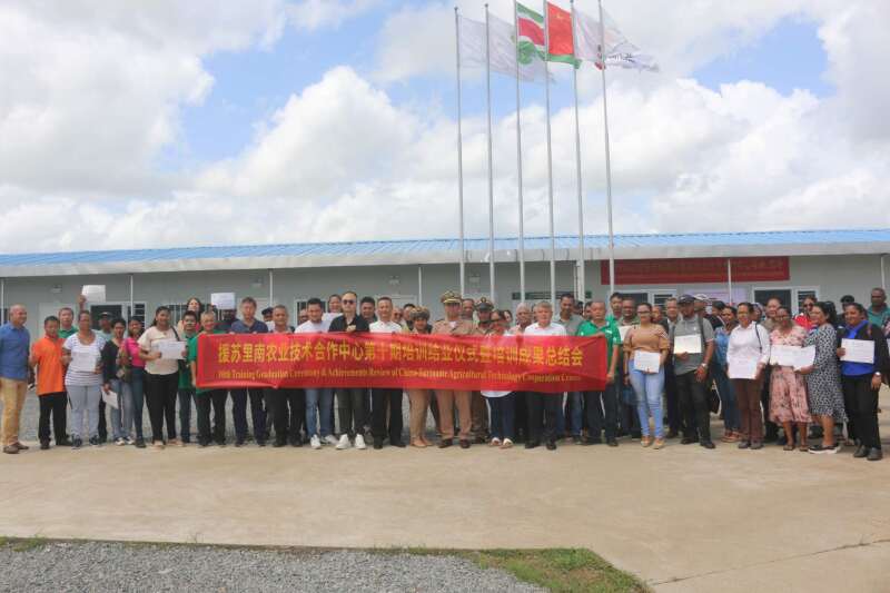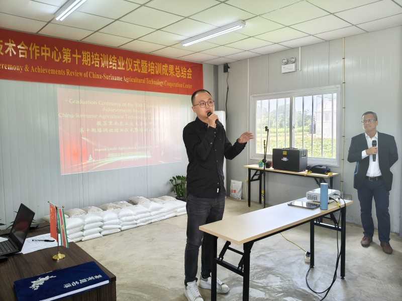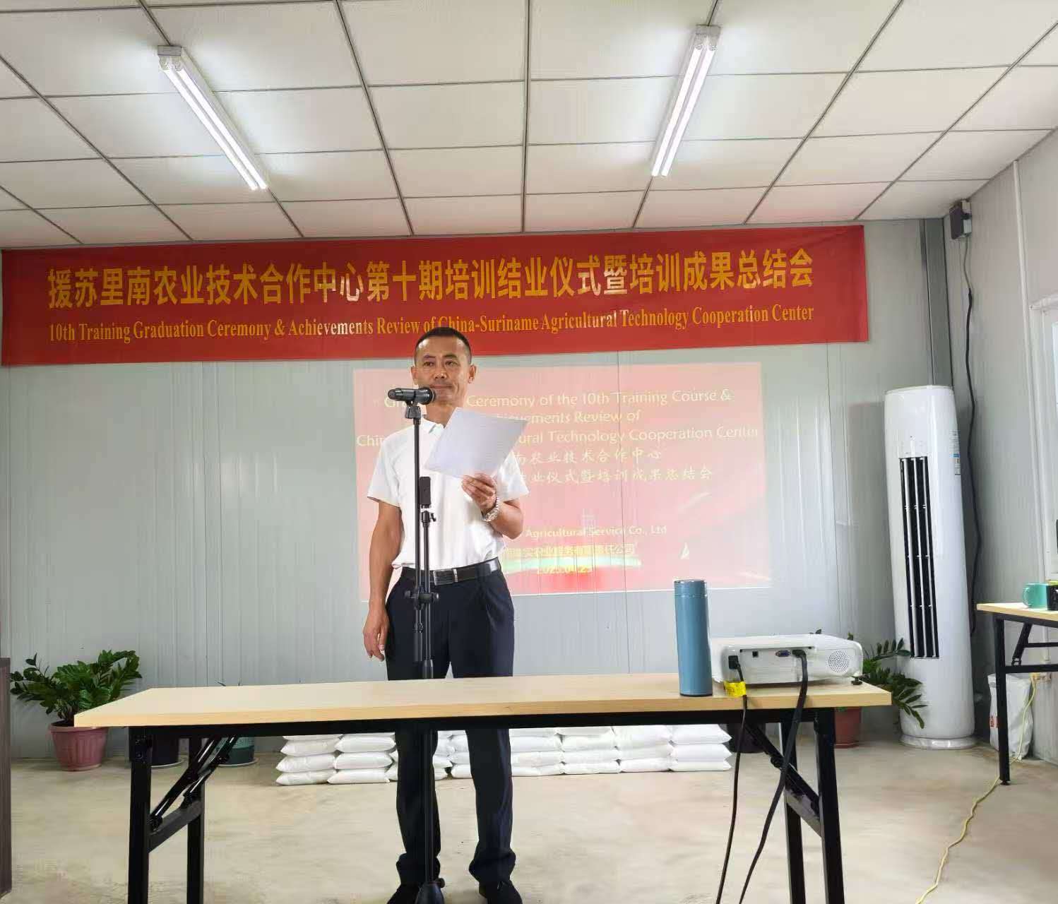 4月25日,驻苏里南使馆贾金易参赞出席援助苏里南农业技术援助项目培训班结业式暨项目总结会并致辞。苏国会议员、农渔部项目官员、萨拉马卡区 专员(市长)、中资企业商会负责人以及部分前期班学员代表出席并发言。
